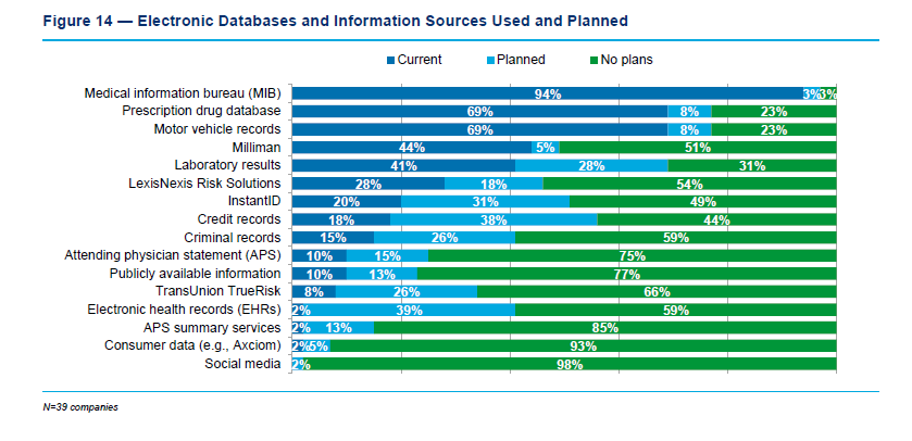 Automated underwriting is possible because companies are able to gather enough information about the applicant through other data sources. LIMRA research finds almost all insurers (94 percent) use data from medical information bureau (MIB). Seven in 10 insurers access prescription drug databases and motor vehicle records. While only two percent of companies are using electronic medical records (EHRs), 39 percent say they plan to start using them – the highest increase planned reported. (see chart)