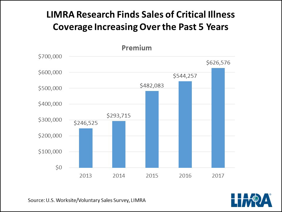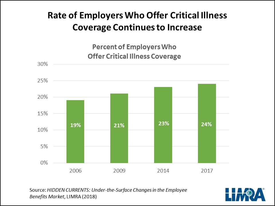 As the popularity of consumer-directed health plans continues to rise, the number of consumers who find themselves with unplanned medical costs is also on the rise. High out-of-pocket medical costs are becoming a frequent threat to consumers’ financial security. To help offset these expenses, more employers are now offering supplemental health products – like critical illness coverage. LIMRA research found 24 percent of employers offered critical illness coverage in 2017 compared with just 19 percent in 2006.