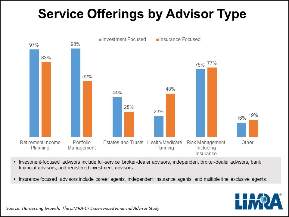 “As competition grows, consumers now expect their financial advisor to offer a broad range of products and services to meet their individual financial needs,” said Laura Murach, LIMRA associate research director for distribution. “As a result, we are seeing similarities across all practice models in terms of their service and product offerings. And by offering a wider array of services, advisors can deepen their relationships with clients.” (chart)