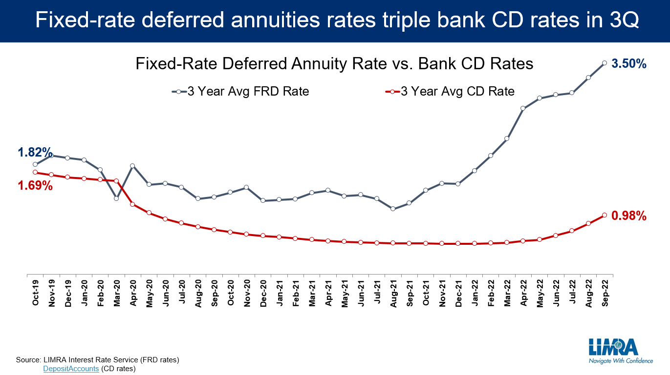Total fixed-rate deferred annuity sales were $30 billion in the third quarter 2022, 161% above third quarter 2021 results. This is the best sales quarter for FRD products ever recorded. In the first nine months of 2022, FRD annuities totaled $74.6 billion, 77% higher than the same period last year. LIMRA expects fourth quarter FRD sales to fall below third quarter results as alternative product solutions become more competitive in an inverted yield curve environment. Still, FRD sales will close in on $100 billion in 2022, a record for annual FRD sales.